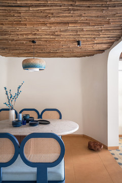 The palette is a striking interplay of monotone walls punctuated by bursts of indigo blue. This delicate use of color, along with the custom thread art ceiling hangings by Muskan Kalwani, infuses the space with a sense of whimsy and wonder. Other notable material selections include Asian Paints' Powder Puff Argelia for wall textures, lights from Clay Mango and Changi, ceramics from The Orby House, and Decowood veneers. The bathroom fittings are from Aquant.