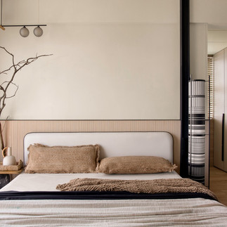 In the second bedroom, Studio Jaene introduces a subtle rhythmic energy through a floor-to-ceiling fluted wall panel. This architectural backdrop frames a minimalist, white-piped headboard, creating a soft yet structured aesthetic. A striking, oversized cylindrical floor lamp with a graphic monochrome pattern acts as a functional art piece, breaking the neutral palette with a touch of modern flair. The room is completed with floor-to-ceiling wardrobes in a pale wood finish, ensuring the space remains clutter-free while maximizing the sense of vertical volume and quietude.