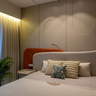 The bedrooms at Serene Abode move away from the "all-white" minimalist trope, embracing intentional vibrancy through texture rather than sheer volume.