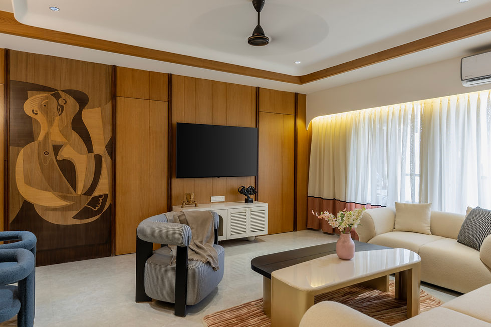 The Focal Wall: A stunning floor-to-ceiling wooden installation provides a warm, rhythmic backdrop to the television unit, balanced by a large-scale, cubist-inspired marquetry piece that introduces a sense of historical art into a modern setting.