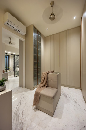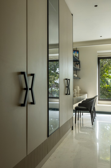 First Floor: A realm of tranquility. The parents’ and the master suite embody grounded calmness. The master suite is a study in quiet sophistication, featuring stone floors, a textured brick wall, and a serene walk-in wardrobe leading to a marble-clad bathroom, perfectly balancing intimacy with openness to the backyard views. The children's room is kept intentionally flexible, a space designed for organic growth.